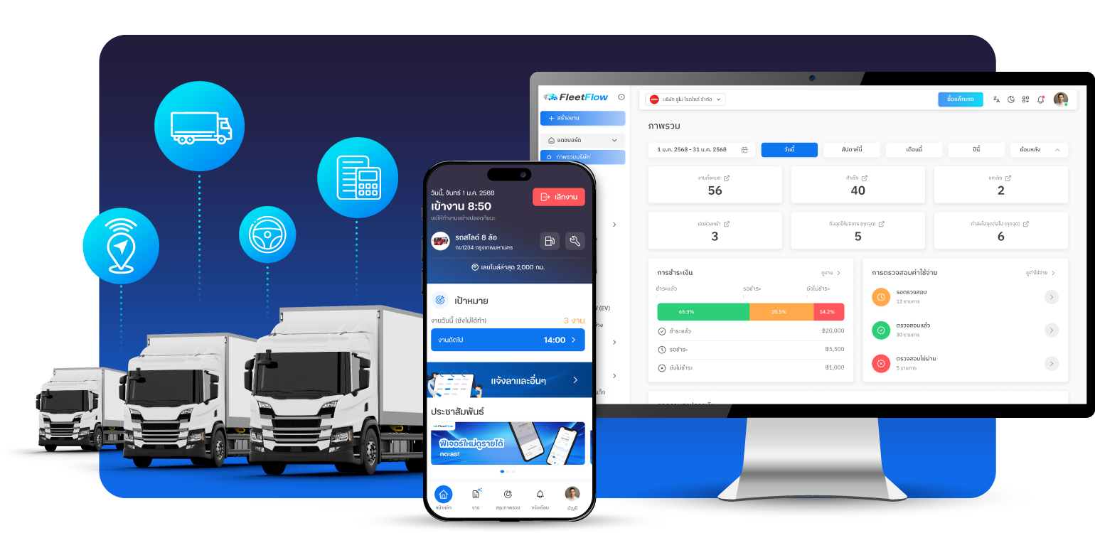 เราเชื่อมต่อและช่วยให้ธุรกิจขนส่งทำงานได้ง่ายขึ้น ไม่ว่าคุณจะเป็นธุรกิจเล็กหรือใหญ่ FleetFlow คือโซลูชันที่ช่วยให้คุณจัดการฟลีทได้ครบจบในที่เดียว